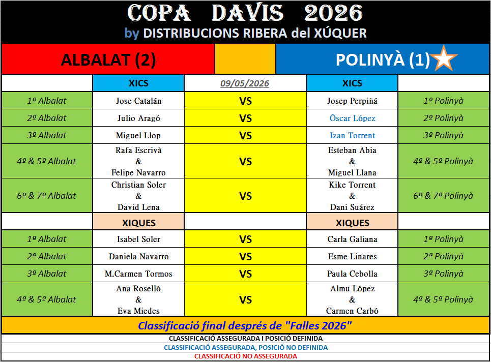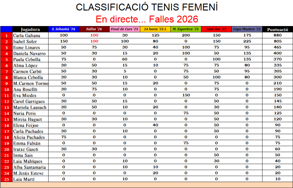 Classificació FINAL al acabar el campionat «FALLES 2026«