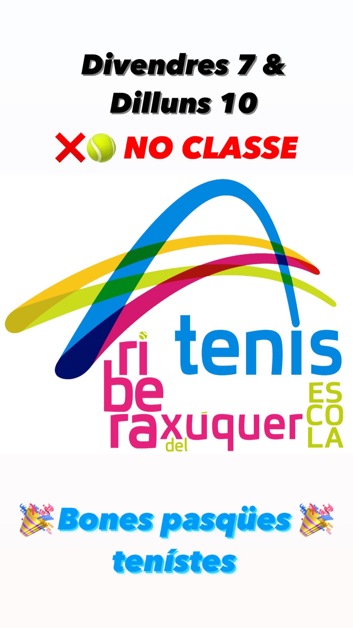 🎾 Hola tenístes 🎾 1️⃣ L’Escola de Tenis no farà classes el divendres 7 i dilluns 10 d’Abril per la Setmana Santa i el dilluns 17 d’Abril tampoc hi haurà classe[…]
