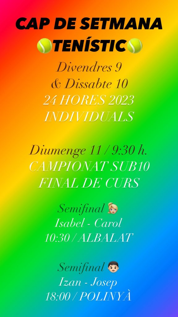 🙄Per si no fora prou, diumenge continua el tenis amb varios partits del campionat “Final de Curs” i la disputa de la categoria SUB10 de l’Escola.